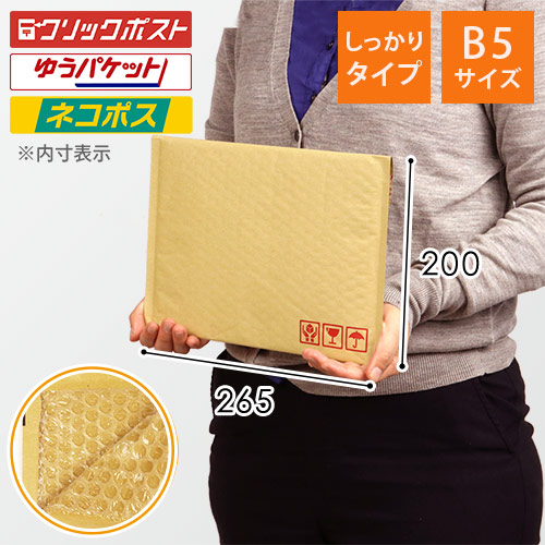 B5サイズでネコポスやゆうパケット対応のクッション封筒(しっかりタイプ)。ハリのある質感で 配送中の衝撃や摩耗に強く、配送後も形が崩れにくいのが特徴です。通販発送に最適です。