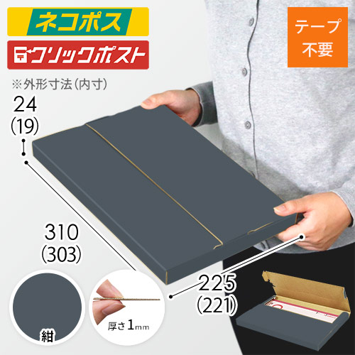 表面に紺色のカラーライナーを使用したメール便ケース。高級感ある見た目に仕上がるため、通販商品の発送やパッケージなどにおすすめです。