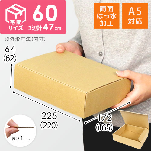 宅配60サイズ・底面はA5サイズより若干大きいサイズの両面はっ水ダンボール箱。組み立て作業が簡単なN式タイプです。A5サイズのカタログ、通販商品の発送に。