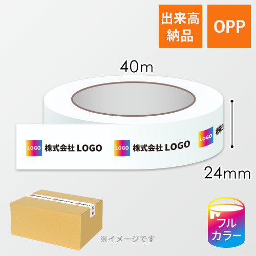 24mm×40m巻のOPPテープ。0.065mm厚。お客様のロゴや社名などをフルカラーで名入れ印刷します。
