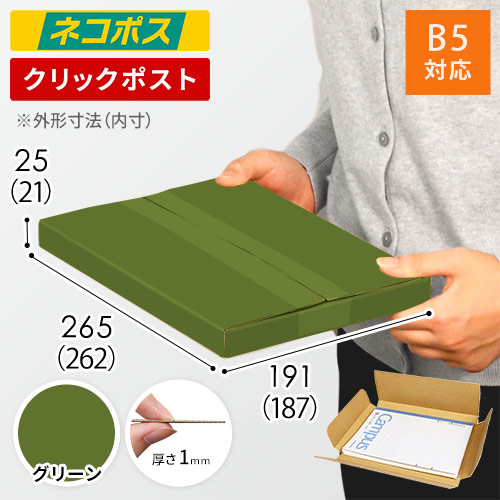 表面に緑色のカラーライナーを使用したメール便ケース。高級感ある見た目に仕上がるため、通販商品の発送やパッケージなどにおすすめです。