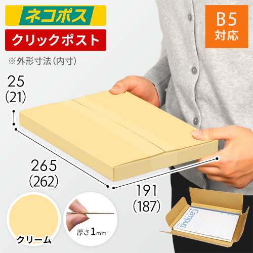 表面にクリーム色のカラーライナーを使用したメール便ケース。高級感ある見た目に仕上がるため、通販商品の発送やパッケージなどにおすすめです。