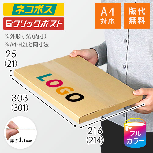 ネコポス・クリックポストサイズ、底面A4サイズの名入れ印刷メール便ケース(A4-H21と同寸法)