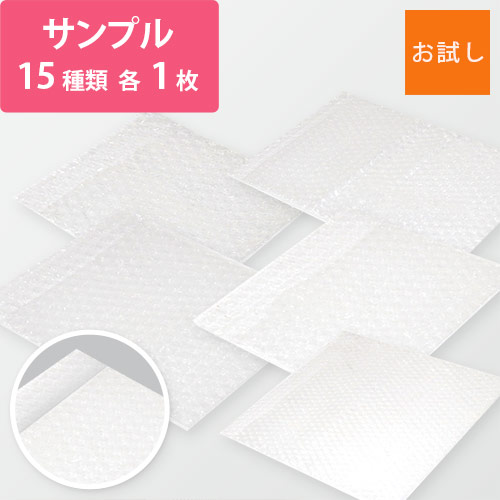 クリアなエアキャップ(袋・フラップあり)のサンプル15種類・各1枚入りセットです。ご購入前のお試しや、サイズ・材質確認にいかがでしょうか。(※法人・個人事業主専用サンプルとなります)