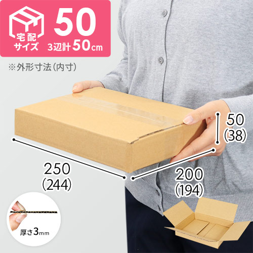 宅配60サイズで発送できる薄型のダンボール箱。サイズは長さ244×幅194×深さ38mmで、A5判の冊子やカタログ、ハンドタオルなどの薄い商品の発送・収納におすすめです。