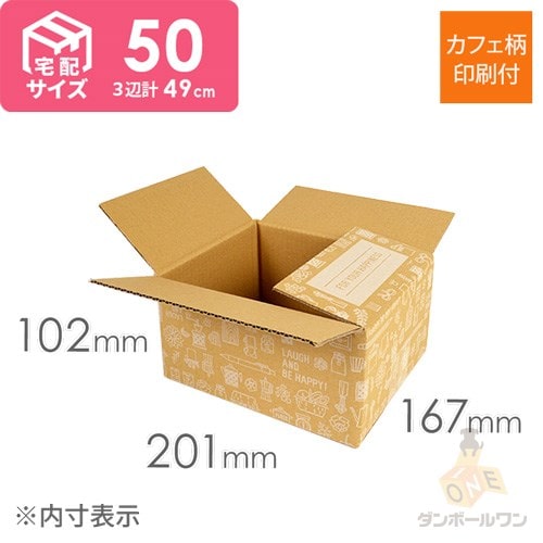 全面にキッチンアイテムやガーリーなイラストのカフェ柄が印刷された、宅配50サイズで発送できるダンボール箱です。
