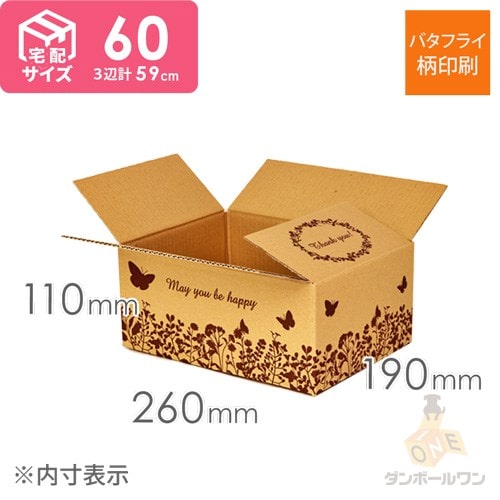全面に草花とバタフライ柄が印刷された、宅配60サイズで発送できるダンボール箱です。