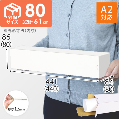 A2サイズ(420×594mm)のポスターや図面、カレンダーなどの書類梱包用の白色ダンボール箱です。