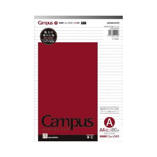 コクヨのレポート用紙、A4サイズ・A罫(7mm罫)。中厚口80枚入りでたっぷり使えます。