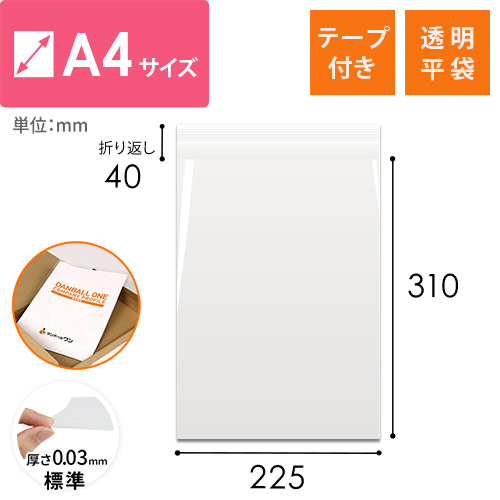 A4が入る大きさで、静電気防止加工されたテープ付きの透明OPP袋。標準的な厚さ0.03mmの袋で、パリッとした質感や透明度の高さが特徴です。DM発送や書類の同封、商品梱包、ラッピングなどにいかがでしょうか。