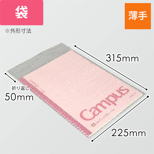 外側に粒がついておりスムーズに出し入れ可能なプチプチ袋。サイズは口幅225×深さ315+折り返し50mm(外寸)で、A4対応です。小粒タイプのため厚みを抑えたいときに最適。