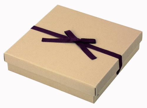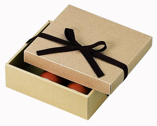高級感あるかぶせ蓋タイプのパッケージ。材質はE/F(1.5mm厚)のダンボールで、表面の色はクラフトです。茶色のリボン(紐)付き。