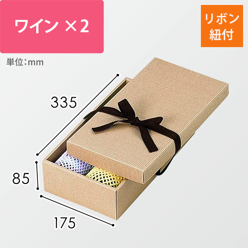 レギュラーワインが2本入る大きさのギフトパッケージ。材質はE/F(1.5mm厚)のダンボールで、表面の色はクラフトです。茶色のリボン(紐)付き。
