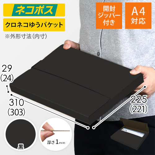 表面に黒色のカラーライナーを使用したメール便ケース。高級感ある見た目に仕上がるため、通販商品の発送やパッケージなどにおすすめです。