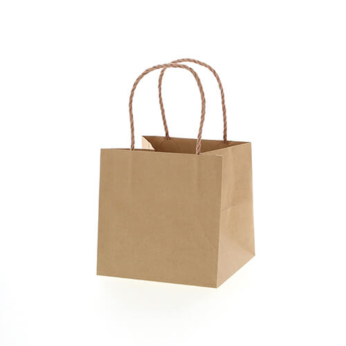 18cm角立方体フォルムの出し入れスムーズな手提げ紙袋。クラフト無地で、和洋菓子など箱もの商品のギフト用や容器に入った食品の持ち帰り用としておすすめです。