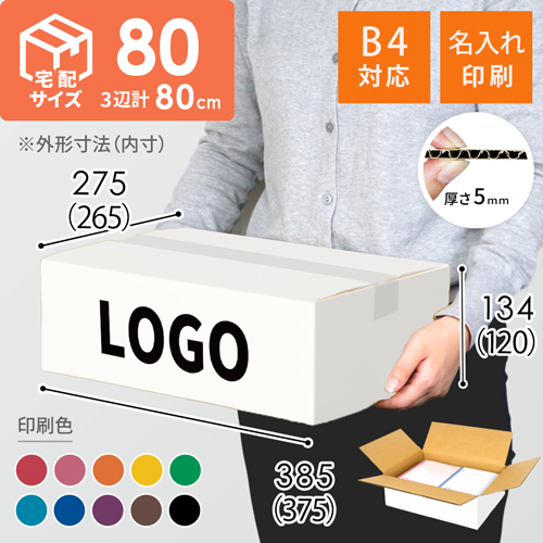 宅配80サイズの白色ダンボール箱に、お客様のロゴや社名などを名入れ印刷します。(B4-80と同サイズ)
