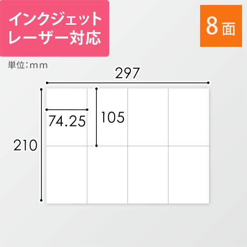インクジェット・レーザープリンターに対応したA4サイズのシール用紙。1シートあたり74.25×105mmのラベルが8面付いています。