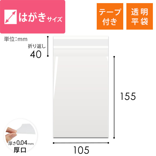 DM発送によく使われる厚さ0.04mmの材質を使用したはがきサイズのテープ付き透明OPP袋。コシのある厚口のフィルムで強度があります。重たいものやかさばるものの梱包におすすめです。