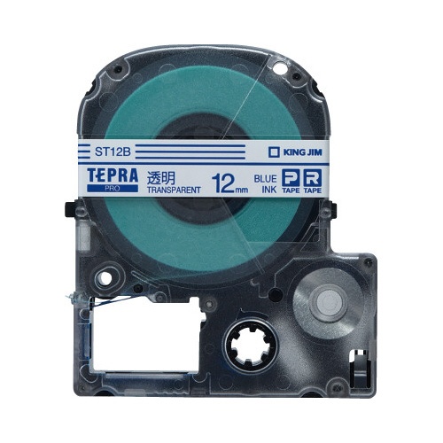 キングジム製テプラPROテープ。透明ラベルに青文字、幅12mm、長さ8m。使用済みカートリッジ回収でエコにも貢献。