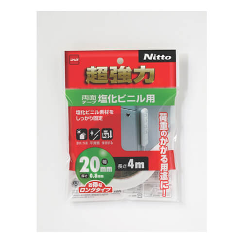 幅20mm×長さ4m×厚さ0.8mmで白色の両面テープ。薄手で目立ちにくく、手で切れます。塩化ビニール素材でもしっかり接着可能です。