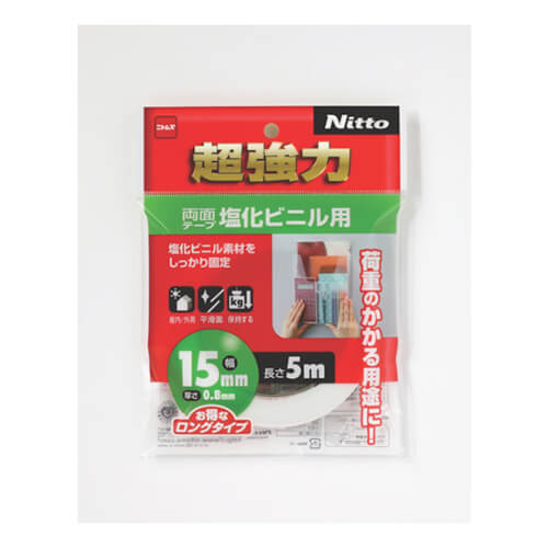 幅15mm×長さ5m×厚さ0.8mmで白色の両面テープ。薄手で目立ちにくく、手で切れます。塩化ビニール素材でもしっかり接着可能です。