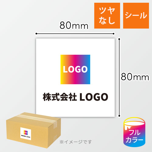 お客様オリジナルデザインのシール印刷です。正方形(縦80×横80mm)サイズで、ツヤ無し用紙となります。