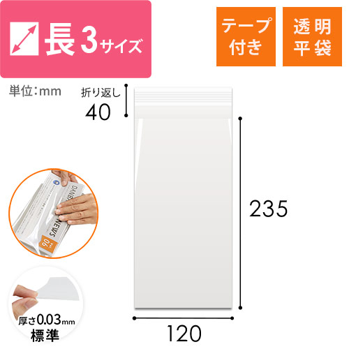 A4三つ折りが入る長3封筒ほどの大きさで、静電気防止加工されたテープ付きの透明OPP袋。標準的な厚さ0.03mmの袋で、パリッとした質感や透明度の高さが特徴です。納品書や請求書の同封、商品梱包、ラッピングなどにいかがでしょうか。