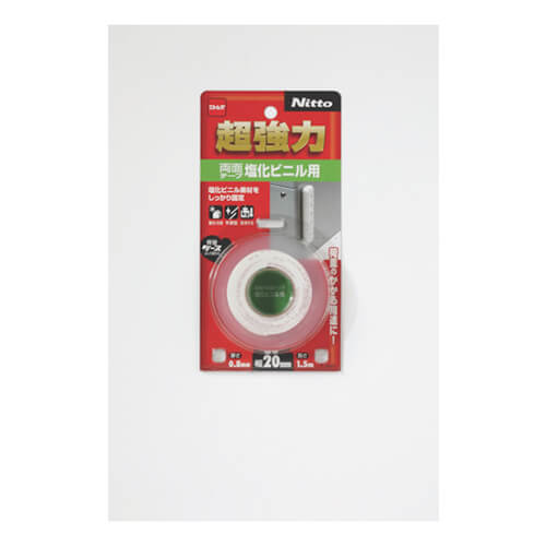 幅20mm×長さ1.5m×厚さ0.8mmで白色の両面テープ。薄手で目立ちにくく、手で切れます。塩化ビニール素材でもしっかり接着可能です。