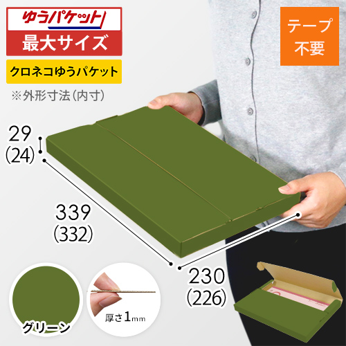 表面に緑色のカラーライナーを使用したメール便ケース。高級感ある見た目に仕上がるため、通販商品の発送やパッケージなどにおすすめです。