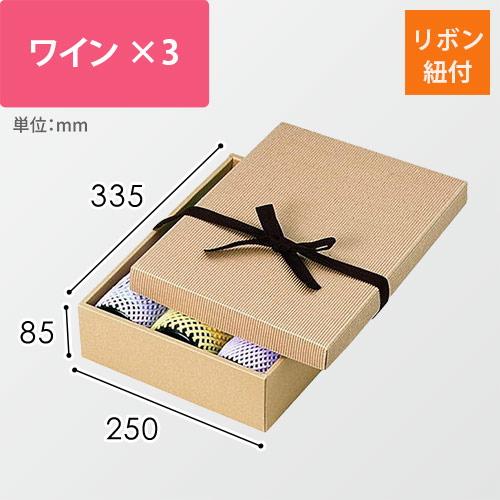 サイズが3335×250×85mmでロングワインが3本入る大きさのギフトパッケージ。お菓子、雑貨にも!ヒモ付きなので、包装紙無しでもお使いいただけます。
