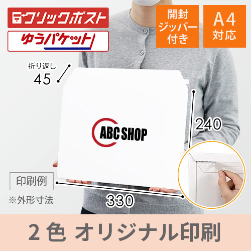 A4サイズ(クリックポスト・ゆうパケット対応)の厚紙封筒に、お客様のロゴや社名などを2色で名入れ印刷します。表面がニス加工されており多少ツヤがあります。