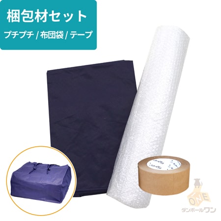 引越しの梱包の必需品「テープ」と「プチプチシート」、「布団袋」が1つになった便利な梱包材セットです。単品の段ボール箱とセットでのご注文がおすすめです。