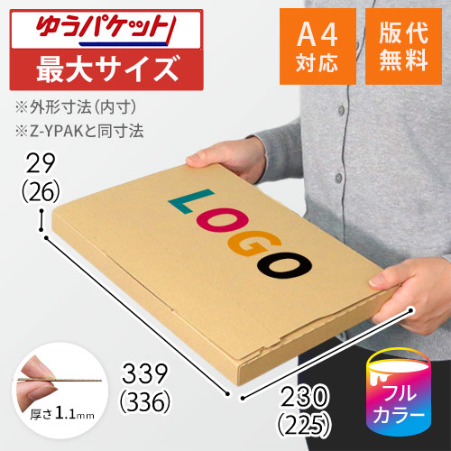 ゆうパケット・クリックポスト最大サイズ、底面A4サイズの名入れ印刷メール便ケース(ZA4-H26と同寸法)