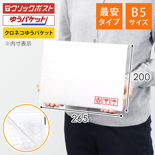 業界最安級の価格を実現!B5サイズでネコポスやゆうパケット対応の白色クッション封筒(最安タイプ)。薄くやわらかな仕上がりで口を広げやすく、梱包作業性に優れています。通販発送に最適です。