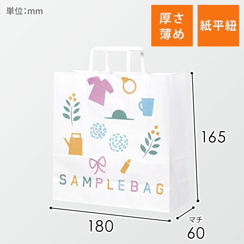 幅180×マチ60×高さ165mmで平紐・白色のオリジナル印刷紙袋。小ロットから手軽に作れるため、はじめてオリジナル紙袋を作る方や今の紙袋を見直したい方におすすめです。