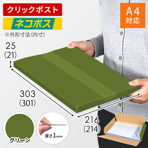 表面に青菜色のカラーライナーを使用したメール便ケース。高級感ある見た目に仕上がるため、通販商品の発送やパッケージなどにおすすめです。