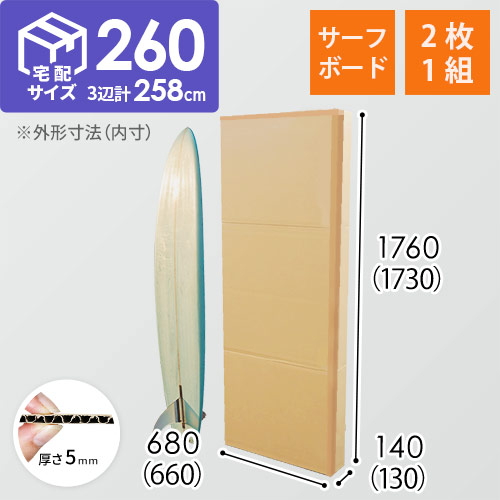 サーフボード梱包用のダンボール箱です。2枚1セットで、佐川急便最大サイズ(宅配260サイズ)に対応しています。