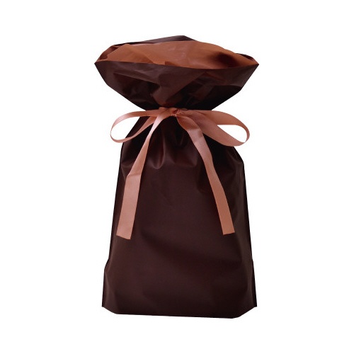リボンを引っ張るだけで包める、店舗でも家庭でも使える巾着袋。マットな質感の梨地外袋と光沢のある内袋の二重構造です。