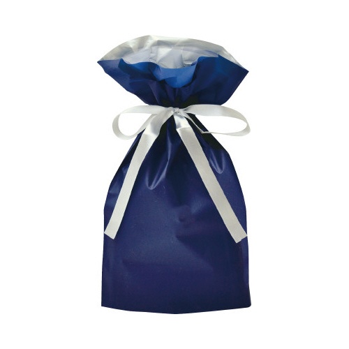 ネイビーの巾着袋。リボンを引っ張るだけで簡単にラッピングできます。店舗でもご家庭でも!