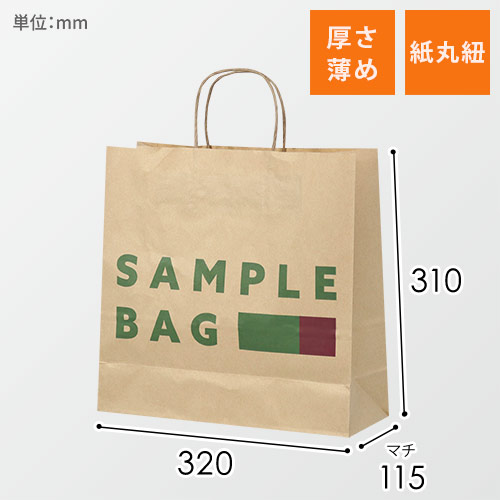 320×115×310mmで丸紐・茶色のオリジナル印刷紙袋。小ロットから手軽に作れるため、はじめてオリジナル紙袋を作る方や今の紙袋を見直したい方におすすめです。