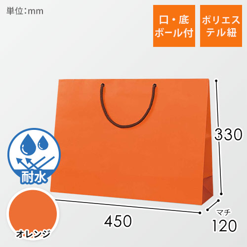 おしゃれなマット仕様の手提げ紙袋。サイズは幅450×マチ120×高さ330です。オレンジ色で使いやすい仕様となっています。商品のお持ち帰りやギフトにいかがでしょうか。