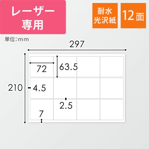 レーザープリンターに対応したA4サイズのシール用紙(耐水光沢紙)。1シートあたり63.5×72mmのラベルが12面付いています。