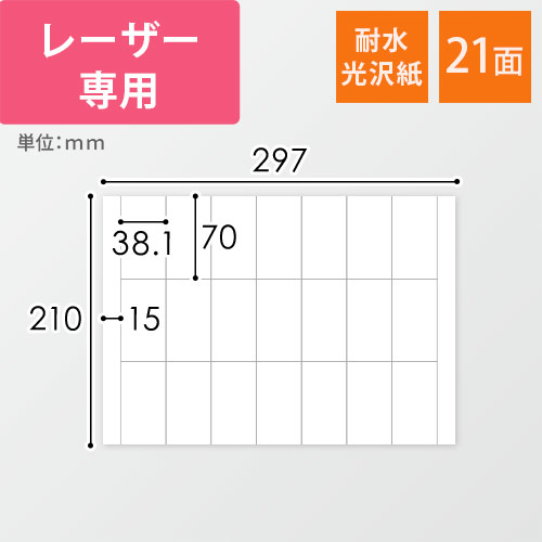 レーザープリンターに対応したA4サイズのシール用紙(耐水光沢紙)。1シートあたり38.1×70mmのラベルが21面付いています。