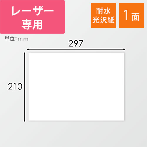 レーザープリンターに対応したA4サイズのシール用紙(耐水光沢紙)。1シートあたり210×297mmのラベルが1面付いています。