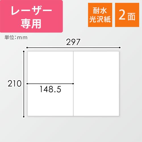 レーザープリンターに対応したA4サイズのシール用紙(耐水光沢紙)。1シートあたり148.5×210mmのラベルが2面付いています。