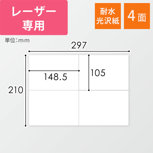 レーザープリンターに対応したA4サイズのシール用紙(耐水光沢紙)。1シートあたり105×148.5mmのラベルが4面付いています。