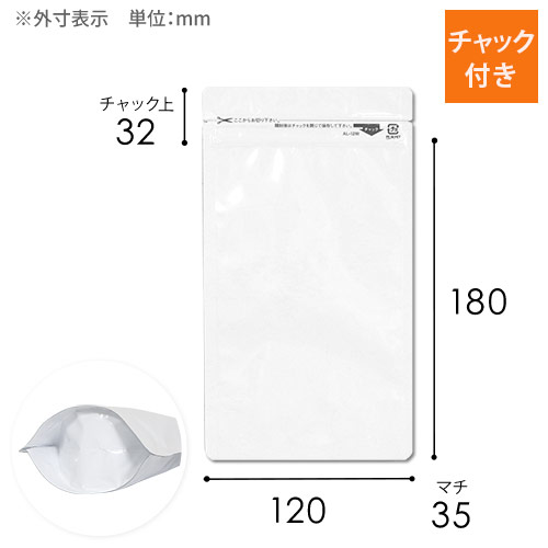 長期保存に適したアルミ素材で120×212(180)×35mm・白色のラミネート袋。ディスプレイしやすく、出し入れも簡単なスタンドパックです。大手メーカーによる日本製の商品なので、長期保存するような食品も安心してご利用いただけます。