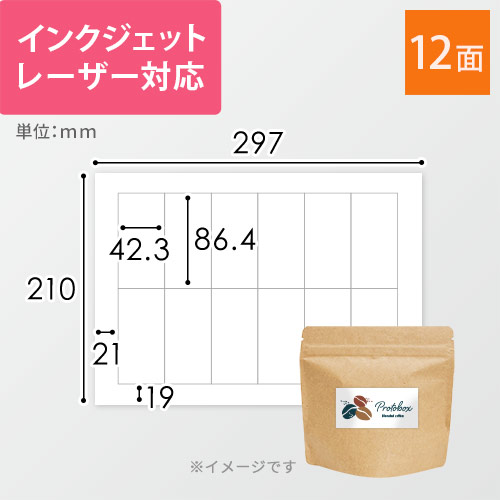 各種プリンターに対応したA4サイズのシール用紙。1シートあたり86.4×42.3mmのラベルが12面付いています。