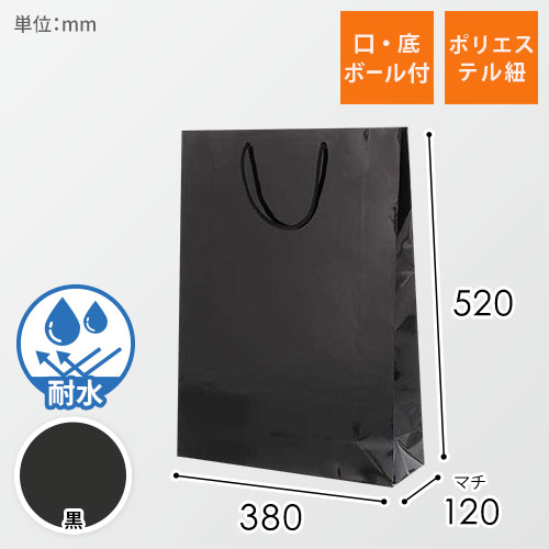 ツヤありPP加工!黒色で持ち手紐付きの高級ギフトバッグ。光沢があり、上品な仕様です。ギフト包装やお持ち帰りにいかがでしょうか。