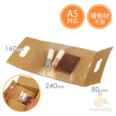 特殊フィルム付きA5サイズのダンボールパットです。フィルムが商品をしっかり固定します。化粧品、健康食品など厚さ40mm程度までの商品梱包に。